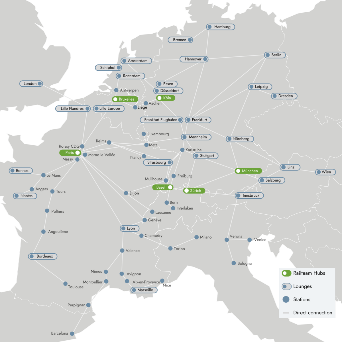 Railteam is an alliance of European rail companies operating international high-speed trains within Europe. Europe's cities and countries rely on these companies to provide high quality service on sustainable and environmentally friendly connections that are also fast, comfortable and safe.